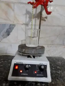 مطابق با تصویر زیر داخل یک “بشر” آب سرد با دمای زیر صفر درجه (به طور استاندارد ۸ تا ۱۰ درجه کمتر از دمای تیتر اسید چرب مربوطه) ریخته، داخل آن یک “مگنت” می اندازیم و دماسنج را داخل آب بشر قرار داده و بشر را روی “هیتر استیرر” می گذاریم. تغییرات حالت ماده داخل لوله مویین و دمای دماسنج را به دقت رصد می کنیم. به دمایی که ماده از حالت کاملاً جامد خارج شده و به یک مایع کدر تبدیل میشود، اصطلاحاً دمای ابری شدن (Cloud Point) می گویند و دمایی که شروع به شفاف شدن می کند و اولین قطره شفاف ظاهر می گردد، دمای تیتر اسید چرب می باشد.