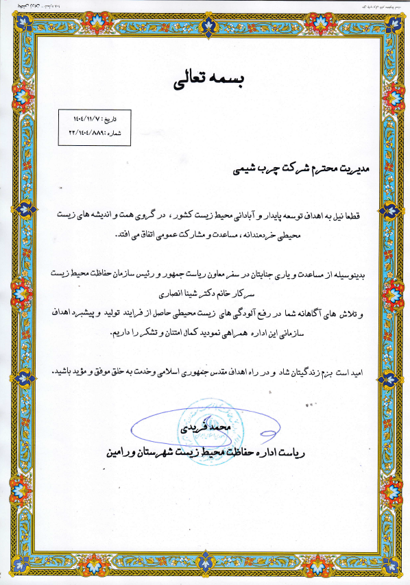 در مدیریت پسماند تولیدی از سوی اداره محیط زیست شهرستان ورامین لوح تقدیری به مدیریت شرکت چرب شیمی اهداء گردید.